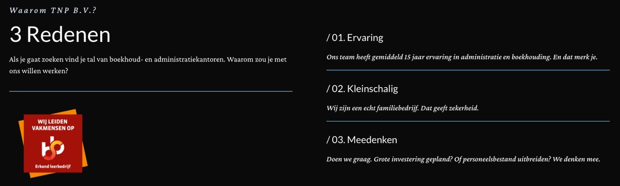 Aangenaam kennis te maken. Wij zijn TNP B.V. Na 15 jaar werkervaring opgedaan te hebben, zijn wij nu een gedreven administratiekantoor waarbij de klant altijd centraal staat. Wij gaan voor de ultieme samenwerking tussen klant en boekhouder. Transparantie, heldere communicatie en vakbekwaamheid zijn dan ook onze kernwaarden. Wij kunnen u geheel ontlasten van alle administratieve-, fiscale verplichtingen en werkzaamheden. U kunt er dus vanuit gaan dat TNP B.V. het maximale (belasting) voordeel voor u realiseert.